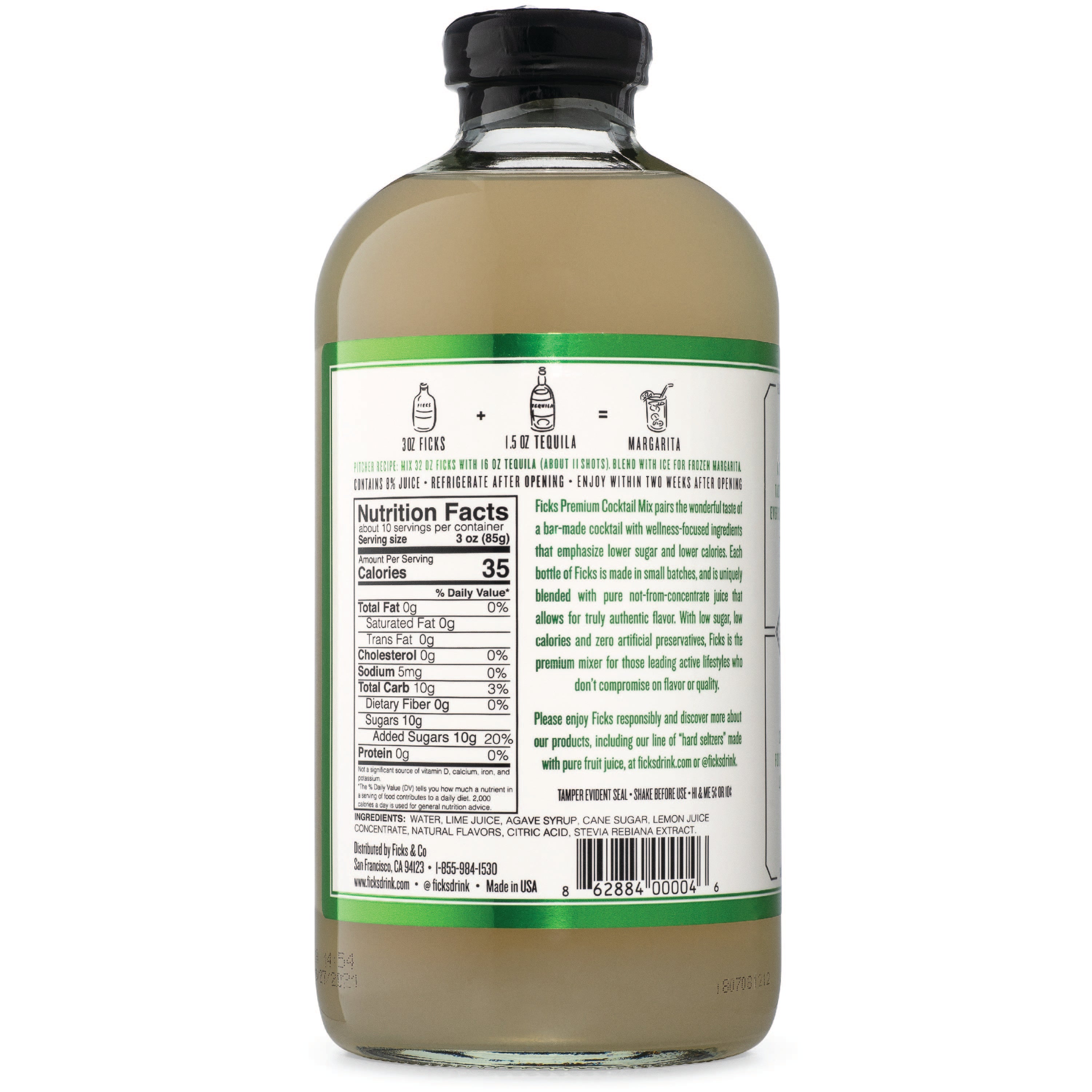 FICKS Premium Margarita Cocktail Mix is made with not from concentrate Mexican limes and agave syrup for authentic, all natural Margarita taste. Lower sugar and real fruit juice let tequila shine for an authentic citrus taste in your craft cocktail, or sip straight over ice for an exotic non-alcoholic drink. Make a low sugar, all natural Margarita cocktail in seconds with FICKS Margarita Cocktail Mix. Each bottle of FICKS Margarita Cocktail Mix makes about 10 cocktails.